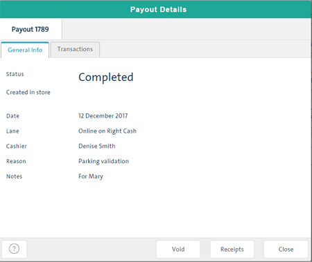 Use the Payout Details popup to view details of payouts transacted in the PAYD Pro PlusTM. You can search for payouts through the Search All Sales and Refunds screen, which is accessed from the Tools button panel on the POS view.