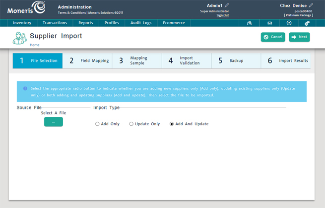 Before proceeding with the import, Moneris recommends performing a backup of your existing supplier data just in case a problem occurs. Use the Backup screen to perform the backup.